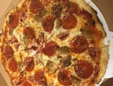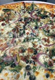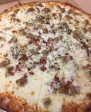 Bacon, Italian Sausage, Alfredo Base, Parmesan, Provolone, Mozzarella.
