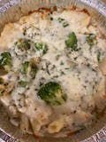 Broccoli florets, onions, and garlic mixed with fettuccine alfredo baked with mozzarella cheese. **NOT AVAILABLE GLUTEN FREE NOT DAIRY FREE